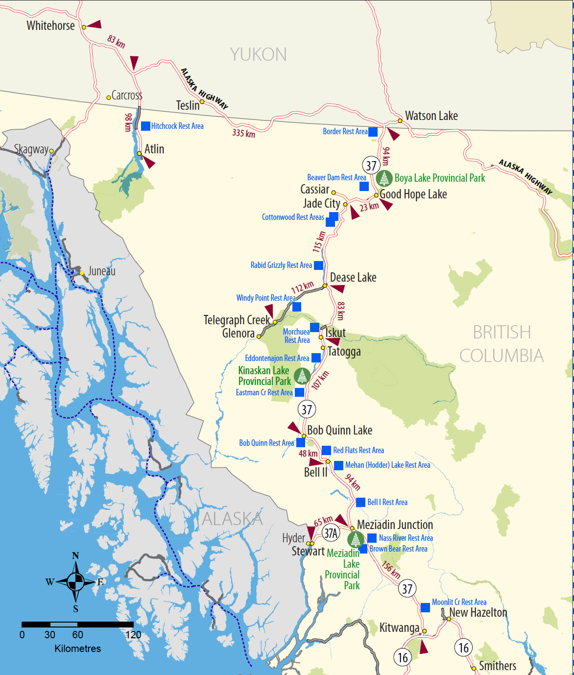 Cassiar Highway 37 is a 724 km/450 mile long road which stretches from Kitwanga, BC to the BC/Yukon border.